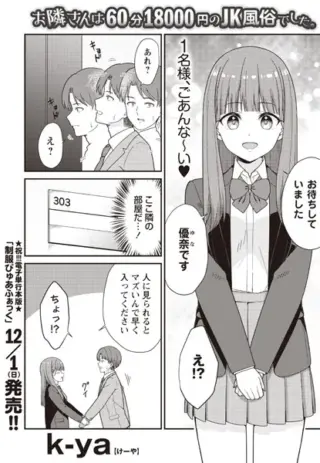 アダルトマンガ単話 お隣さんは60分18000円のJK風俗でした。 飲み会帰りでヘロヘロのサラリーマンが帰宅すると、待っていたのは優奈ちゃん!部屋を間違えたことに気づく暇もなく、彼女はニヤリと笑ってズボンを脱がしてしまう。そして、彼女の大胆な行動に驚いたサラリーマンは、優奈ちゃんにベッドへと誘われる。◇──... 2024.12.09 アダルトマンガ単話
